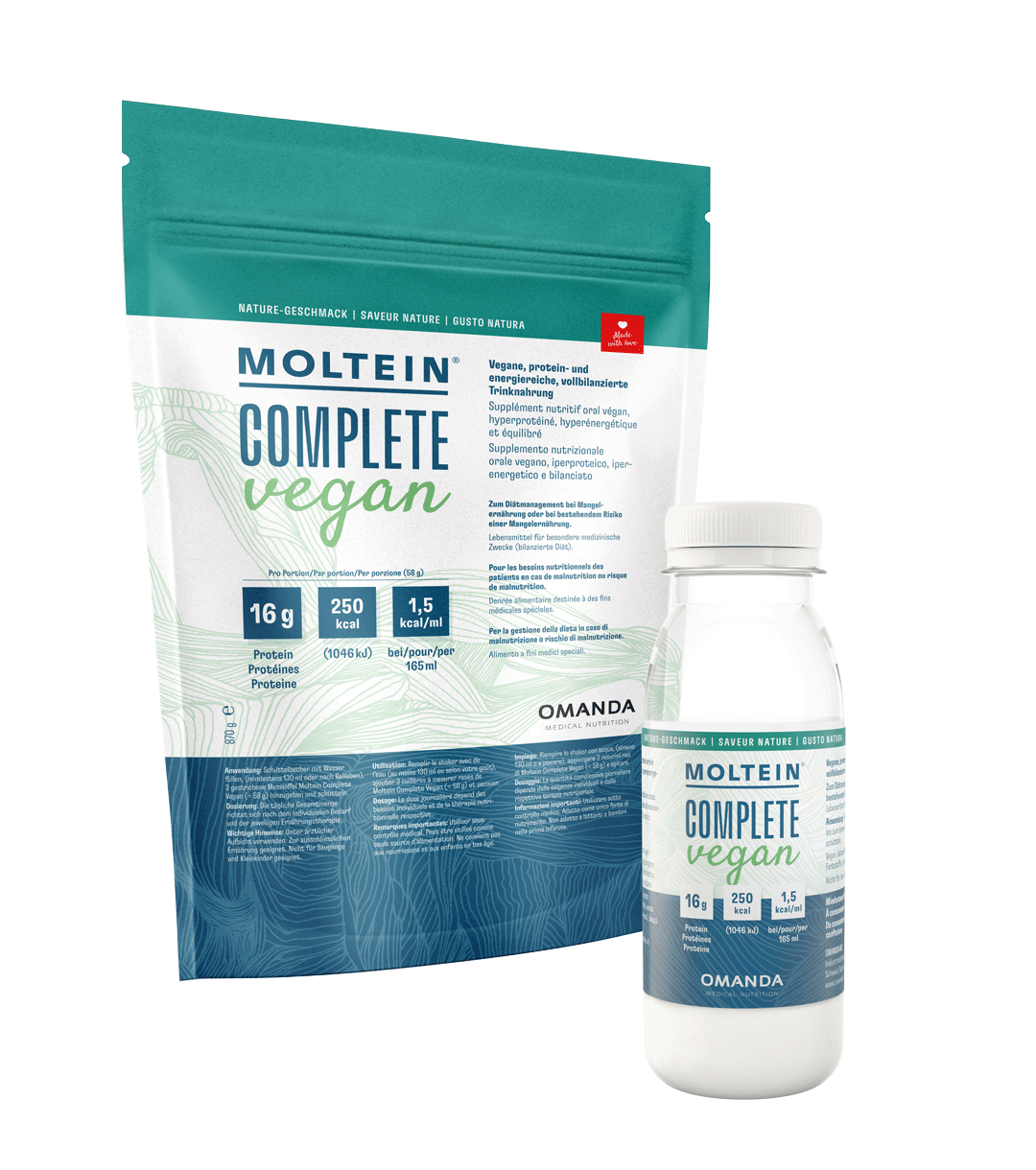 Moltein COMPLETE VEGAN ist eine vegane, protein- und energiereiche, vollbilanzierte Trinknahrung. Es enthält hochwertiges Erbsenproteinisolat, vier verschiedene pflanzliche Fettquellen, Kohlenhydrate sowie alle notwendigen Vitamine und Mineralstoffe. Moltein COMPLETE VEGAN ist die erste vegane vollbilanzierte Trinknahrung aus der Schweiz – für die Schweiz.